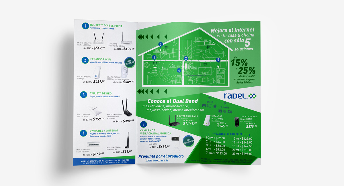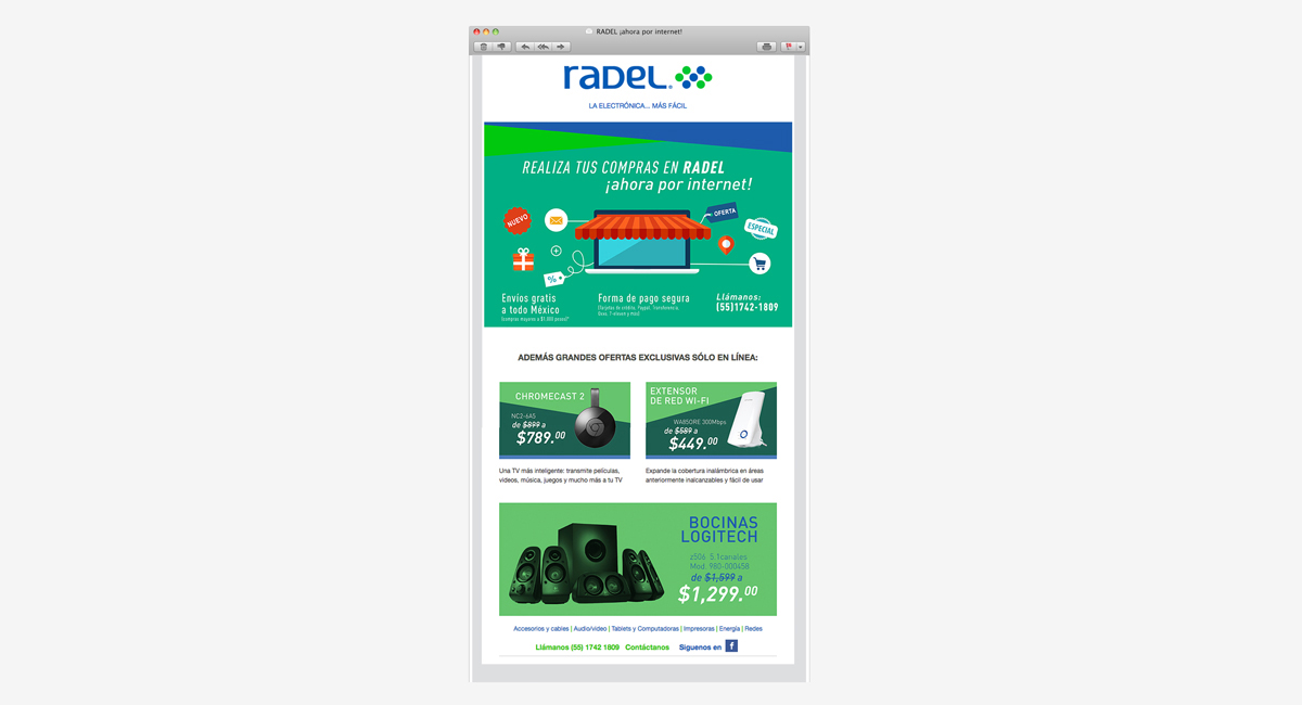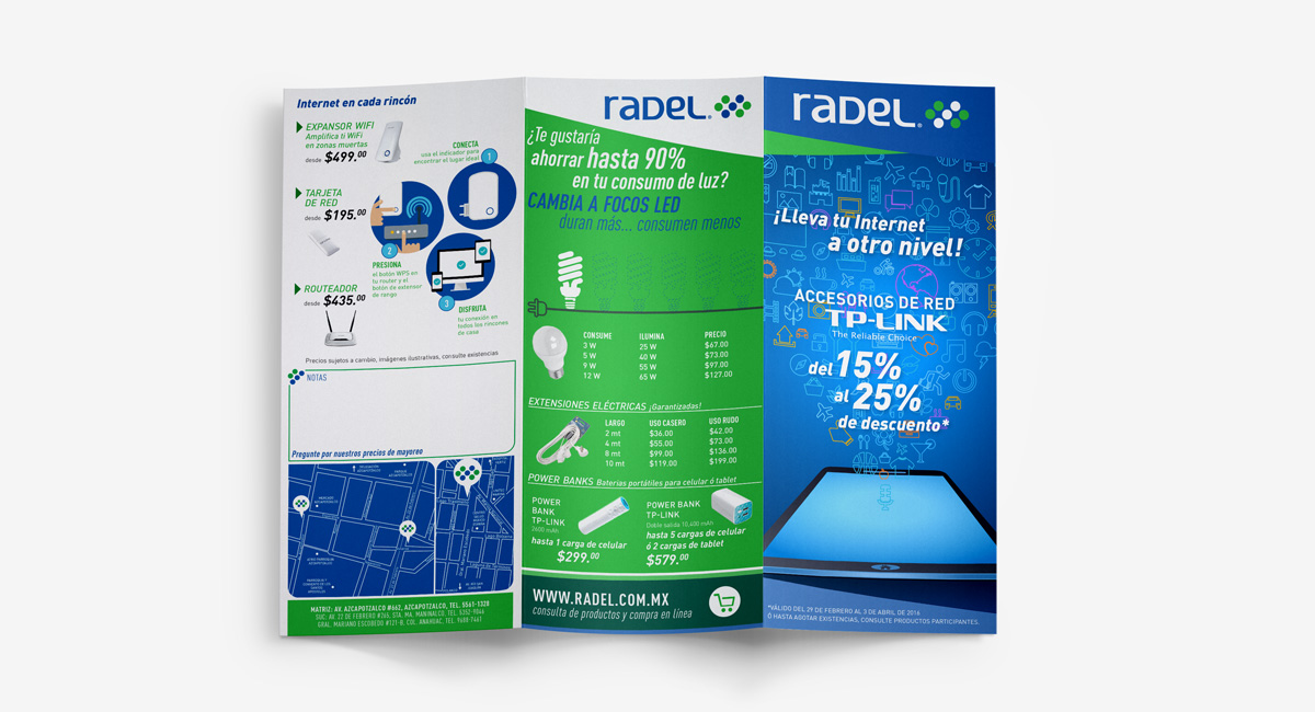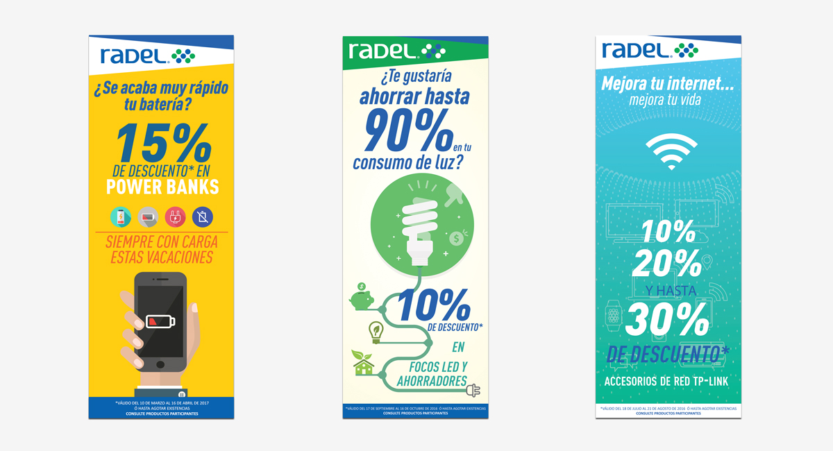 La propuesta de línea de diseño refuerza la identidad de Radel con la intención de unificar los materiales de difusión, logrando una visibilidad y personalidad propias. Se replanteó el diseño del tríptico que se distribuye mes con mes, para ser un material más claro e incluso didáctico en el que el cliente pueda identificar la función de los productos a fin de cubrir sus necesidades; la misma imagen se trasladó a una campaña de mailing para completar la estrategia de difusión de la marca. Se diseñó una identidad que refuerza y unifica la imagen en todos los canales de difusión de la marca.